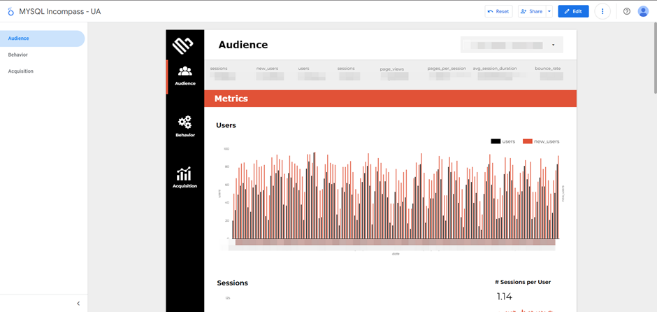 The report was designed and implemented in Looker Studio to back up essential data and provide clear visual representations of Audience, Behavior, and Acquisition metrics. The following sections detail the approach taken: