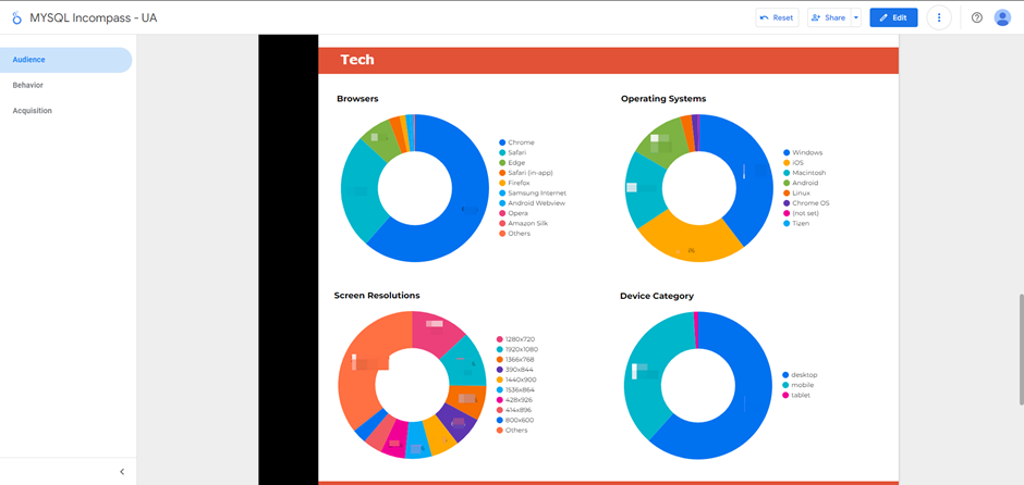 • Pie Charts: The technical information, including Browser, Operating System, Screen Resolution, and Device Category, was represented in pie charts. This visual approach helps in understanding the distribution of user technology preferences.