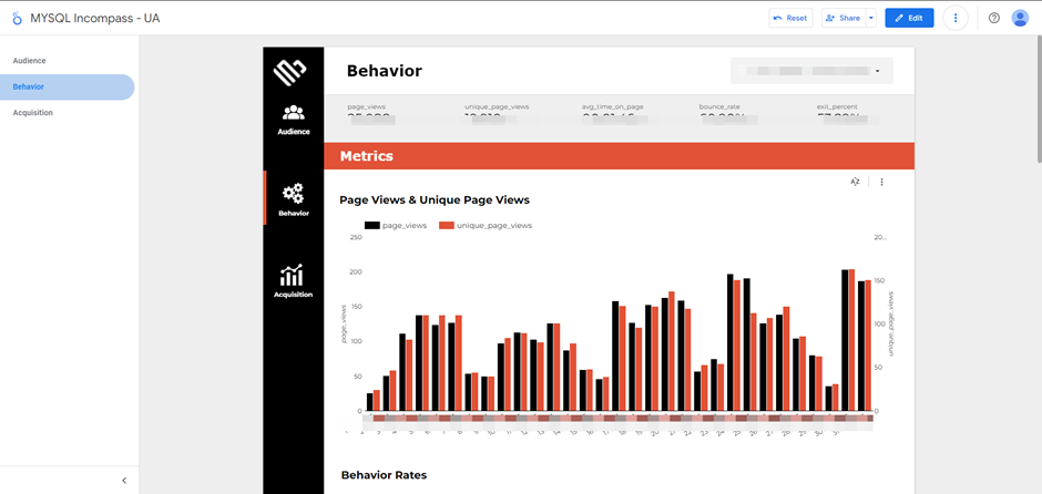 • Scorecards: The Behavior section utilized scorecards to back up data on Page Views, Unique Page Views, Average Time on Page, and other related metrics, offering a detailed look at user interaction on specific pages.