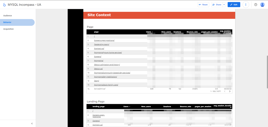 • Tables: Site content data, including Top Pages, Landing Pages, and Exit Pages, was backed up in tabular form. This detailed view supports an in-depth analysis of user behavior and page performance.