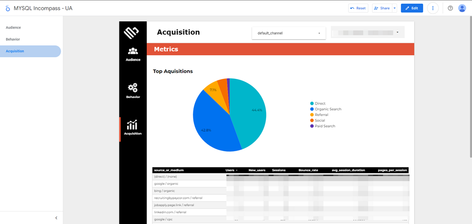 • Detailed Table: A table was created to represent comprehensive information on Channel Group, Source/Medium, Campaign, and Referrer. The table allows for drill-down capabilities, enabling a more granular analysis of acquisition data and helping to identify the most effective channels and campaigns.